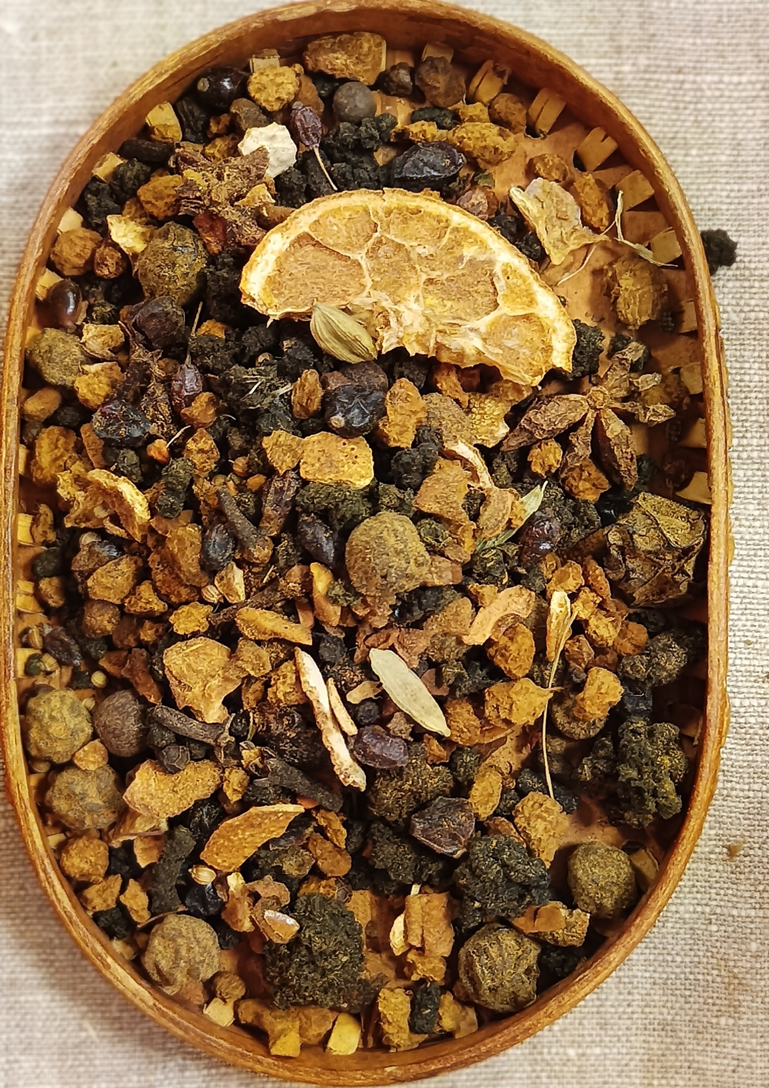 СОСТАВ: Иван-чай ферментированный и гранулированный, чага, бадьян, кардамон, гвоздика, мускатный орех, корица, кориандр, микс перцев, апельсин, лимон, яблоко, барбарис, вишня, шиповник.