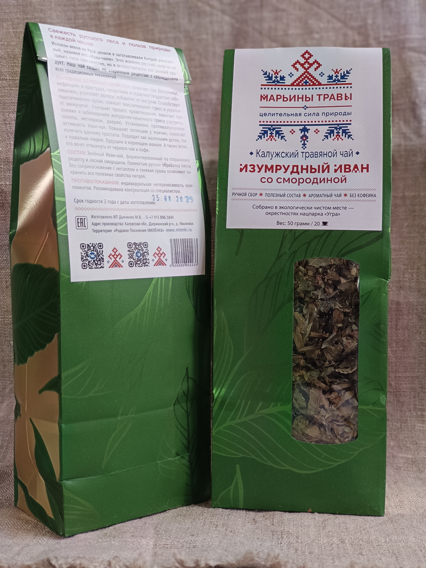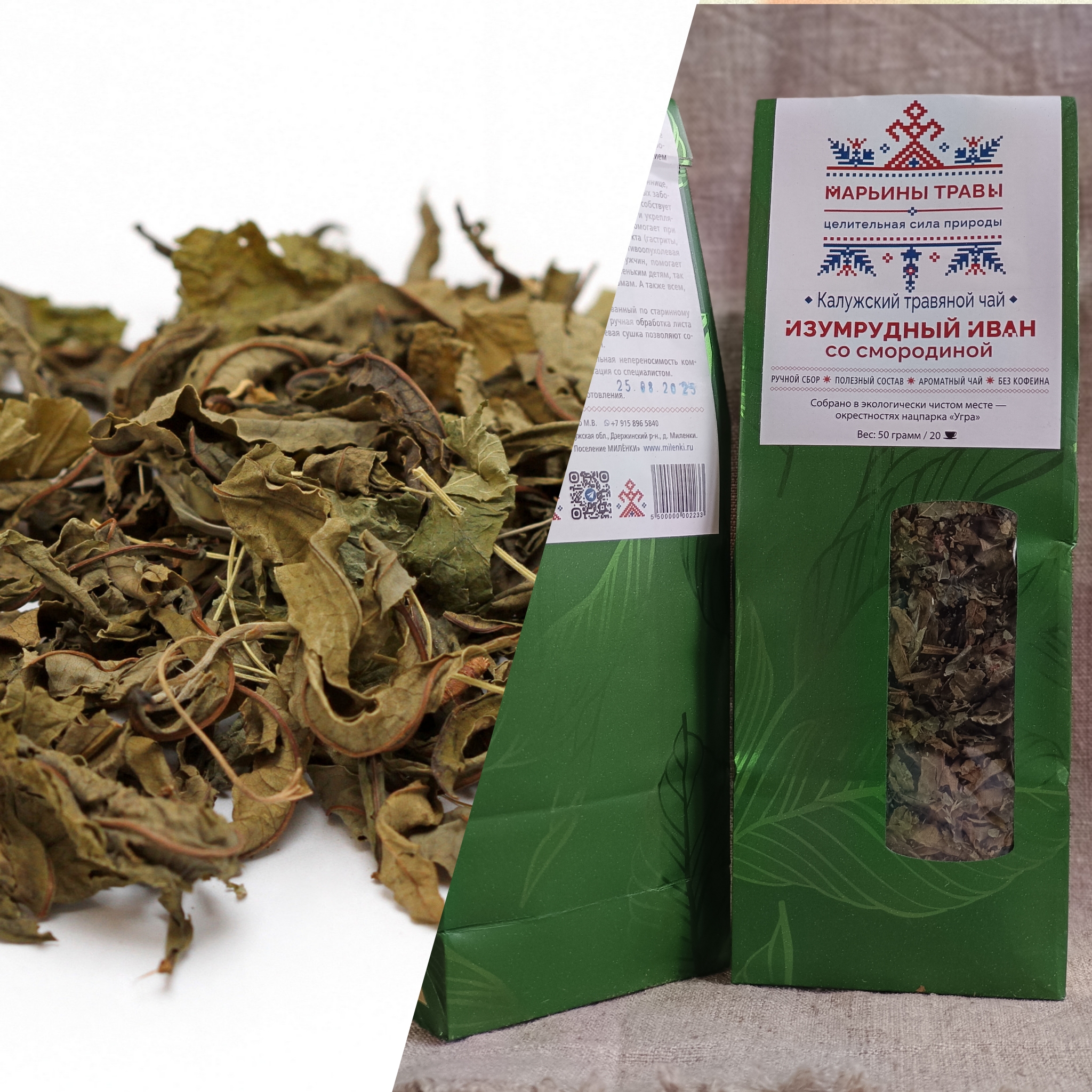 СОСТАВ: Зелёный Иван-чай, слабо-ферментированный по старинному рецепту и лесная смородина. Полностью ручная обработка листа без соприкосновения с металлом и теневая сушка позволяют сохранить все полезные свойства кипрея.
